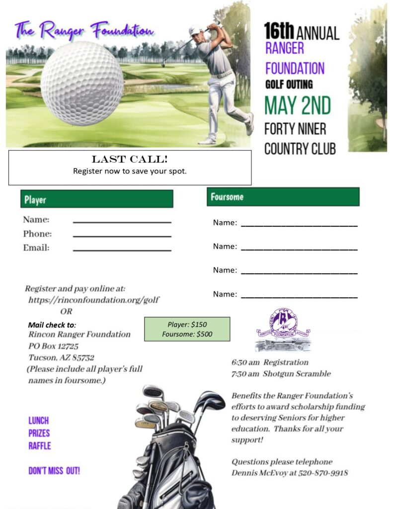 The Foundation invites you to participate in our 2025 Annual Golf tournament. Thank you to everyone that comes out to participate and support this important fundraiser every year. Because of your generosity, we have been able to award scholarships to Rincon graduating seniors to pursue educational opportunities after graduation. With your help, we will continue to encourage and support our fellow Rangers as they graduate and continue their path of learning.